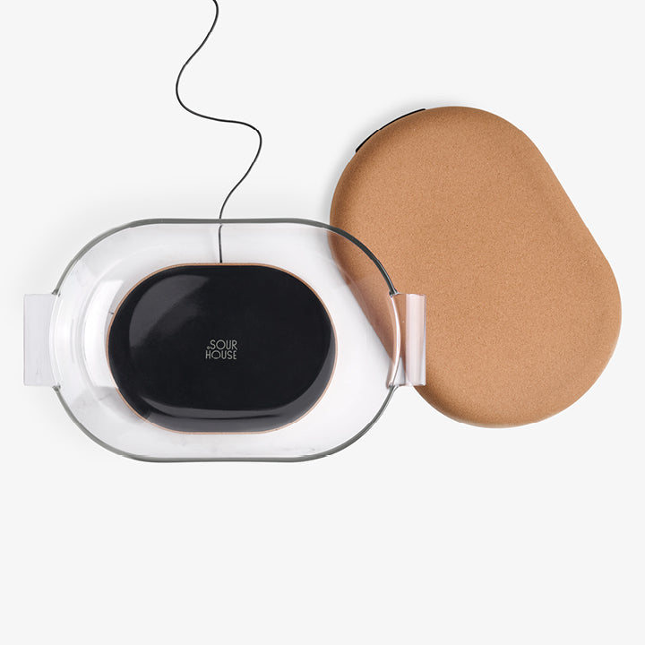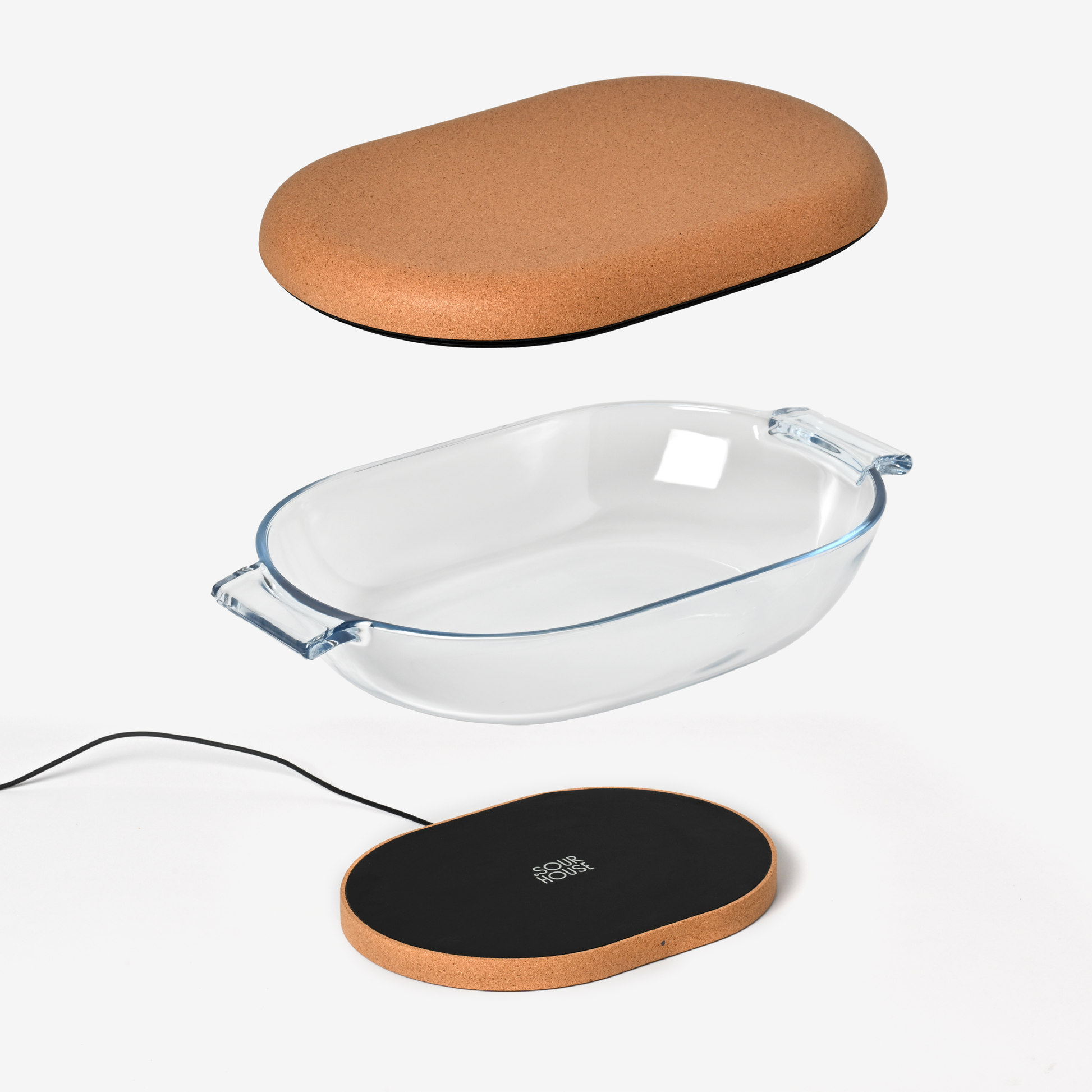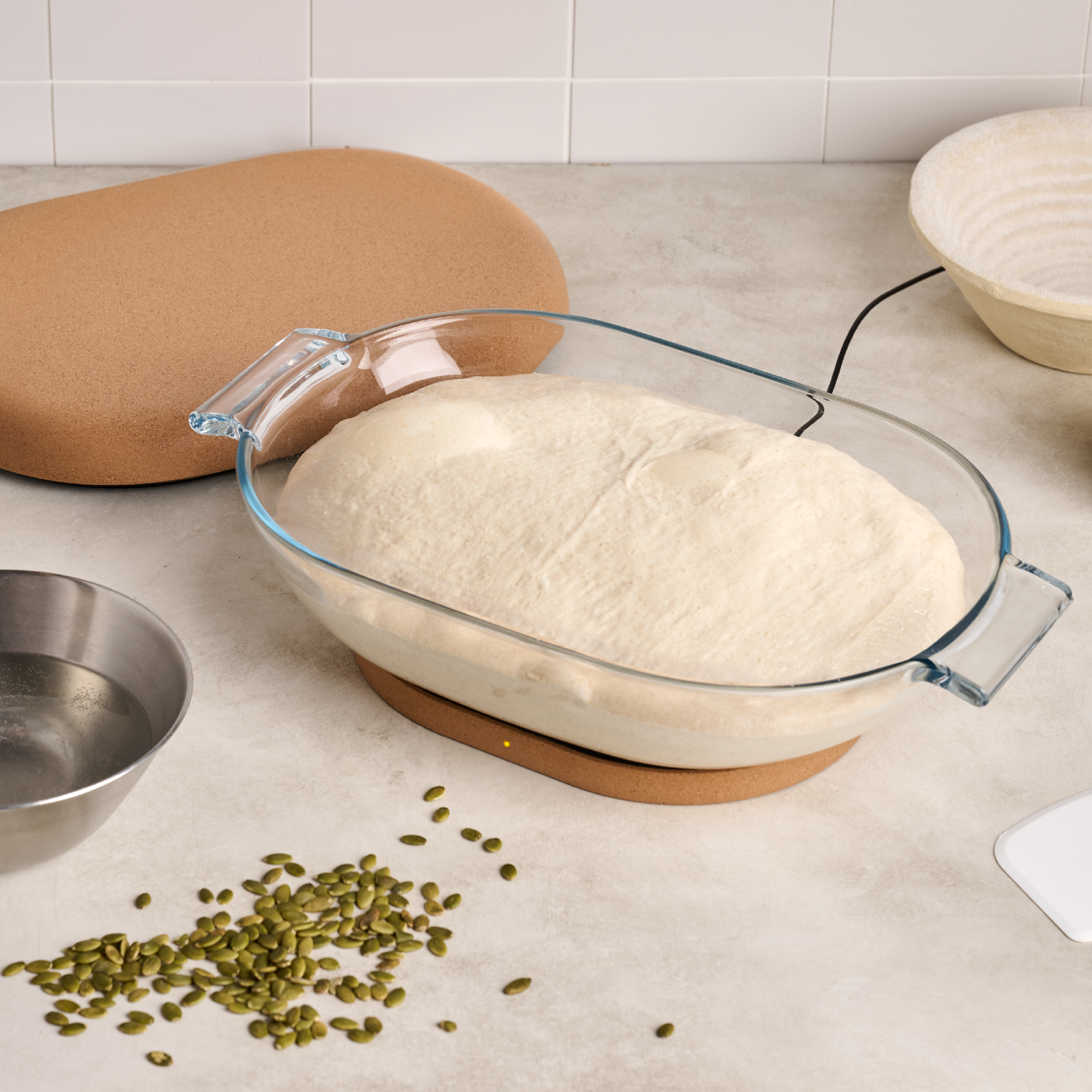 DoughBed combines a warming mat, a glass dough bowl, and a cork lid to create an efficient warming solution that gently and evenly warms dough to 75-82°F (24-28°C) during the first "bulk" proof. The shallow, wide bowl makes mixing and dough handling a pleasure.