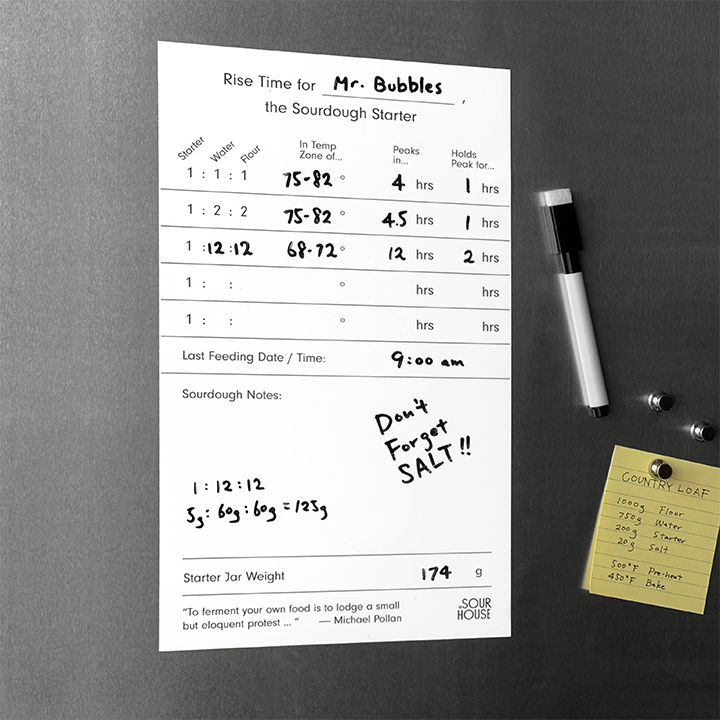 Use the Sourdough Starter Rise Time magnet to track the Rise Time of your sourdough starter. With this information you can put your starter on a schedule, plan your bake day more easily and practice peak-to-peak feeding for super active starter.